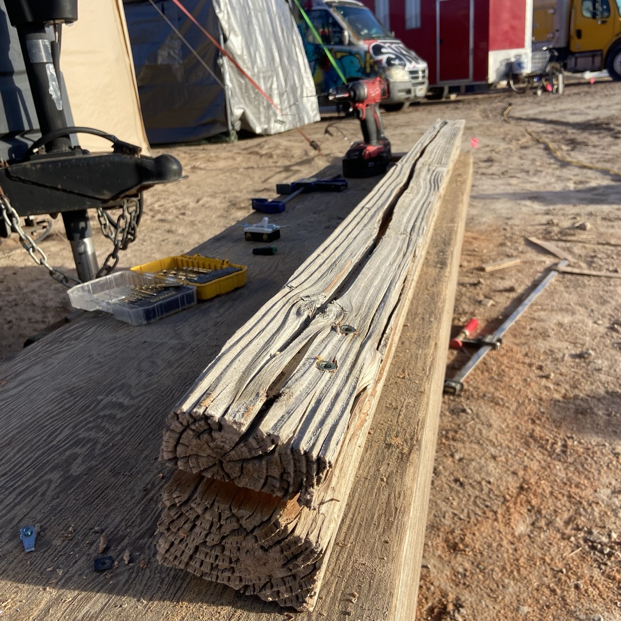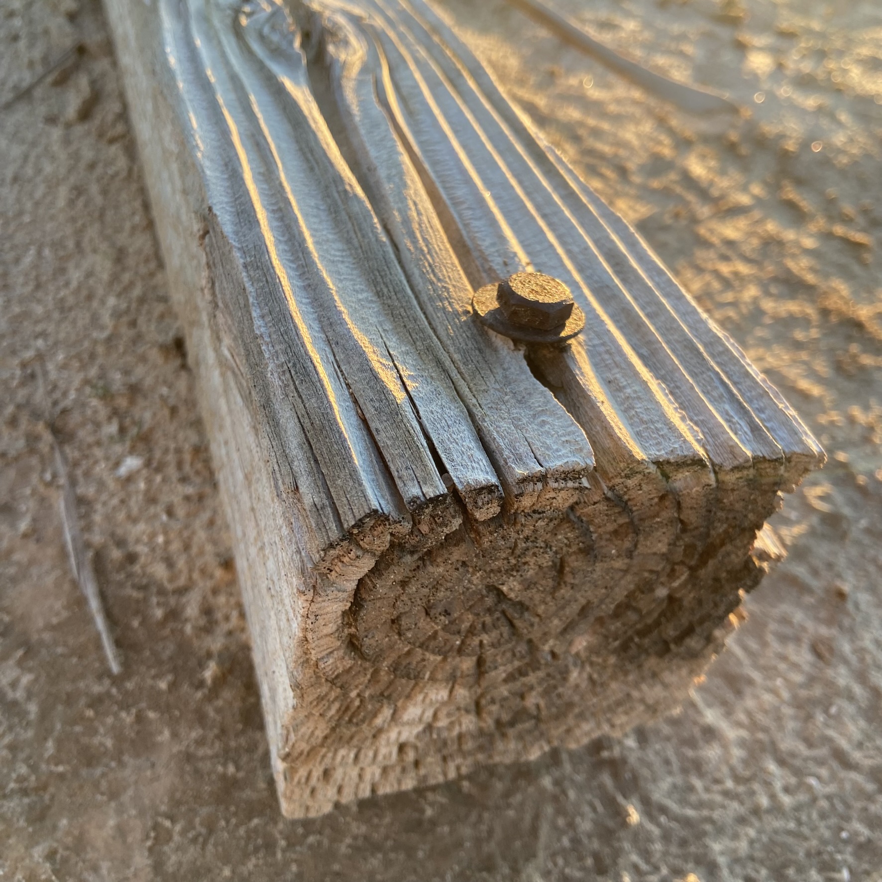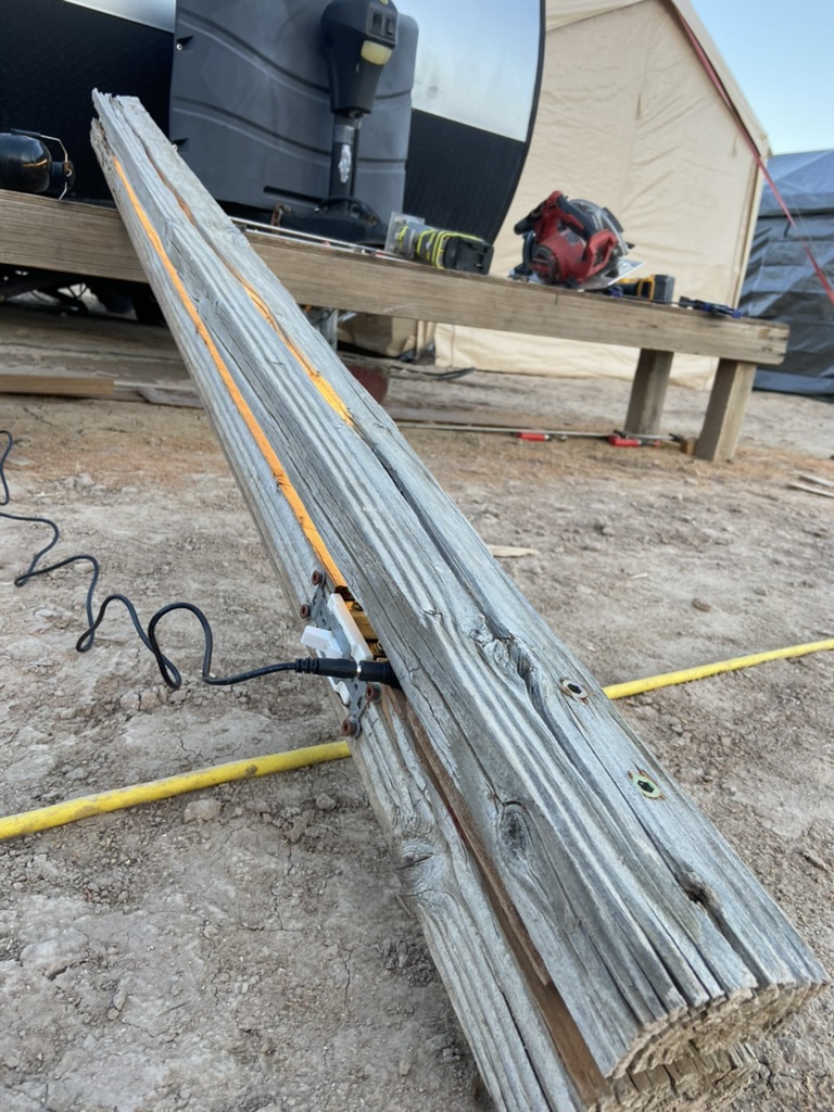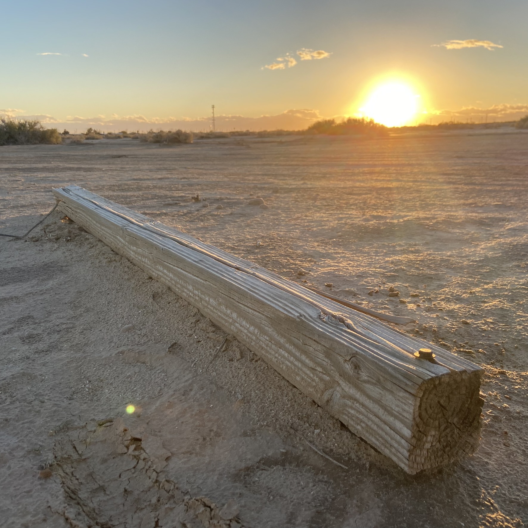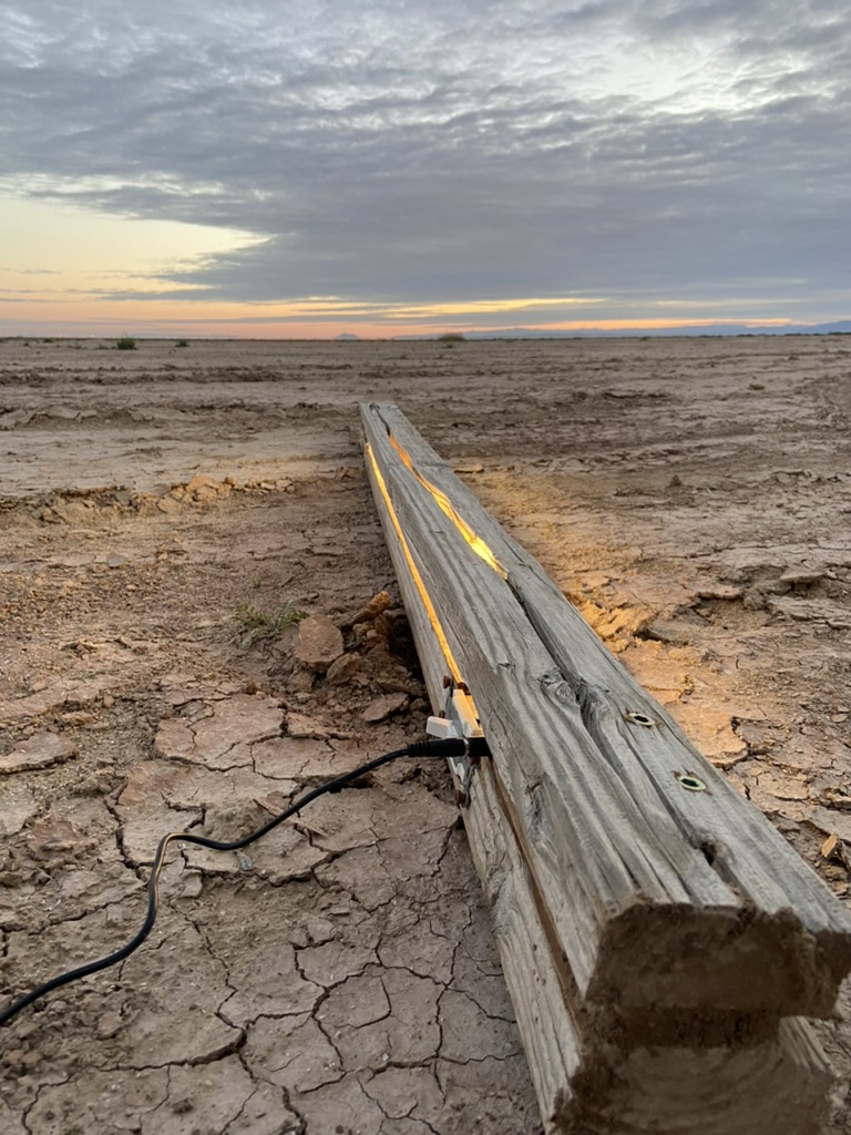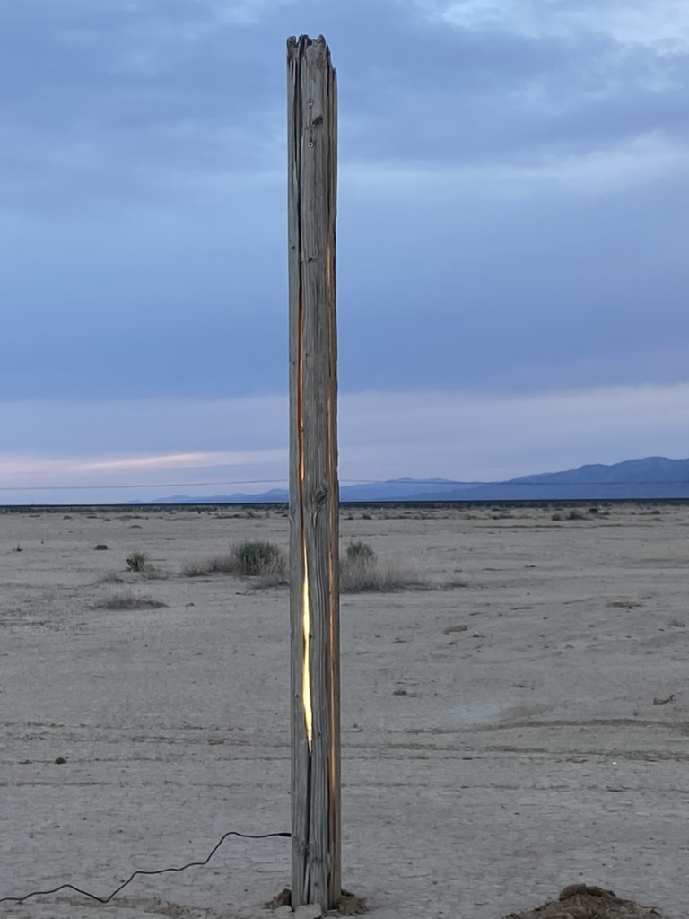 The other night, on a sunset ride, I encountered a 4”x4” post on it’s side. It was weathered, and had a small hex head bolt in it. There was a crack that ran most of one side of it. I envisioned light coming out of it, and rode back to camp with it.